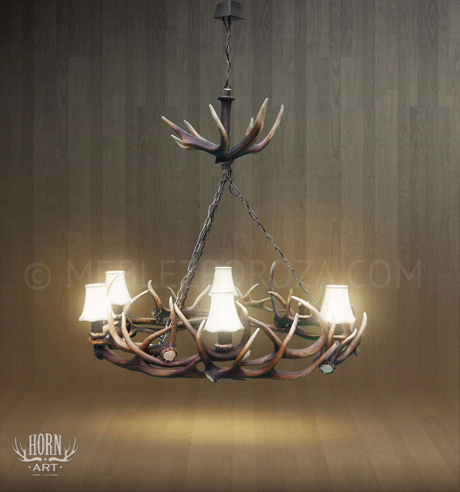 Zapierający dech w piersiach żyrandol z poroża o wyjątkowym wzorze – splecionych ze sobą pięknych sztuk poroża jelenia w naturalnie cieniowanych barwach, które nadają mu ciekawego wyglądu zakończony dziewięcioma żarówkami w kształcie świec. Wyjątkowe oświetlenie, które wprowadza magiczny klimat. Na zawołanie.