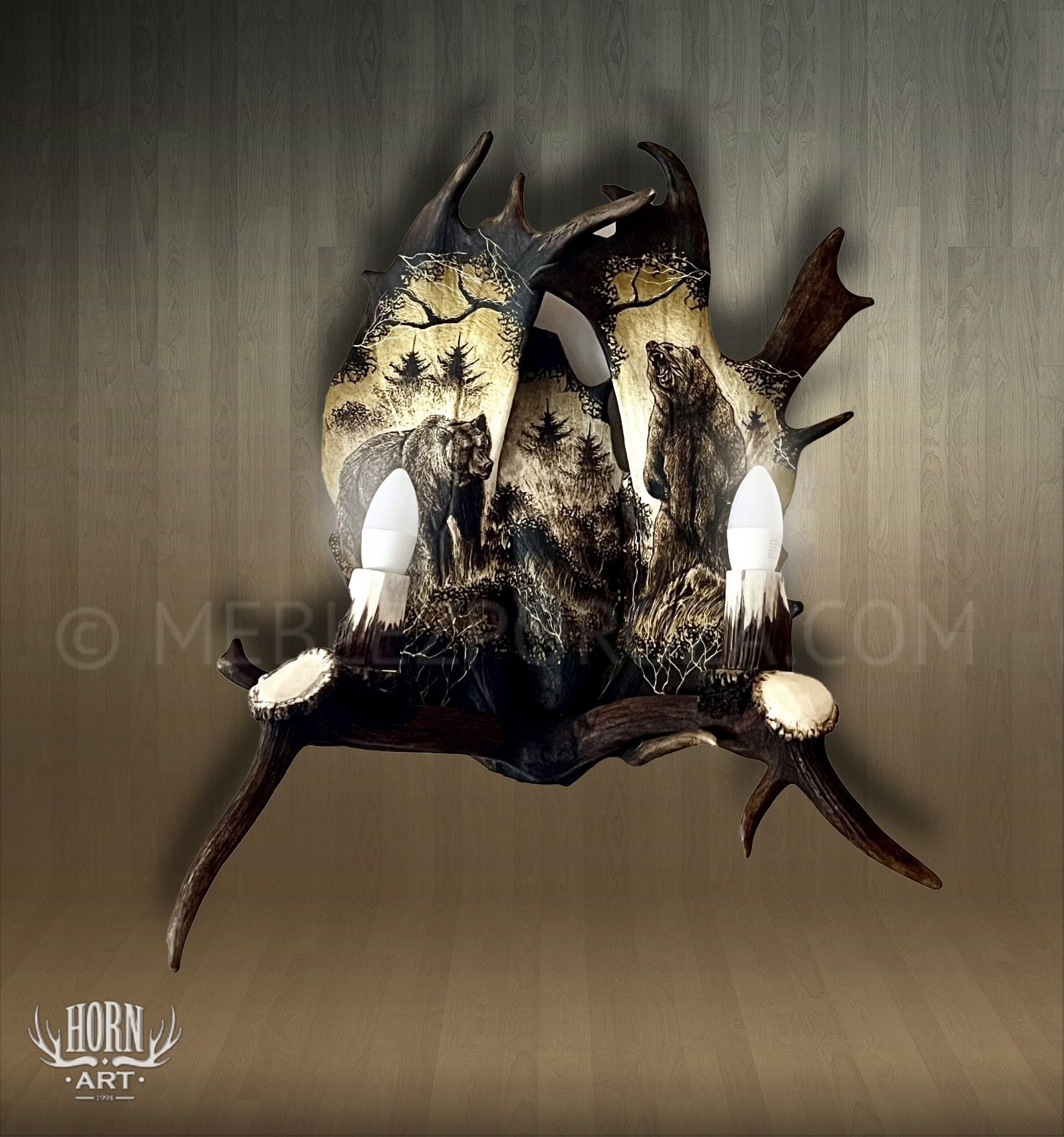 Centralnym punktem dekoracyjnym jest misternie wykonany grawer przedstawiający niedźwiedzie — symbol siły, wolności i dzikiej przyrody. Dwa punkty świetlne zapewniają ciepłe, klimatyczne światło, które pięknie podkreśla naturalną fakturę łopat i wprowadza przytulną atmosferę do wnętrza.