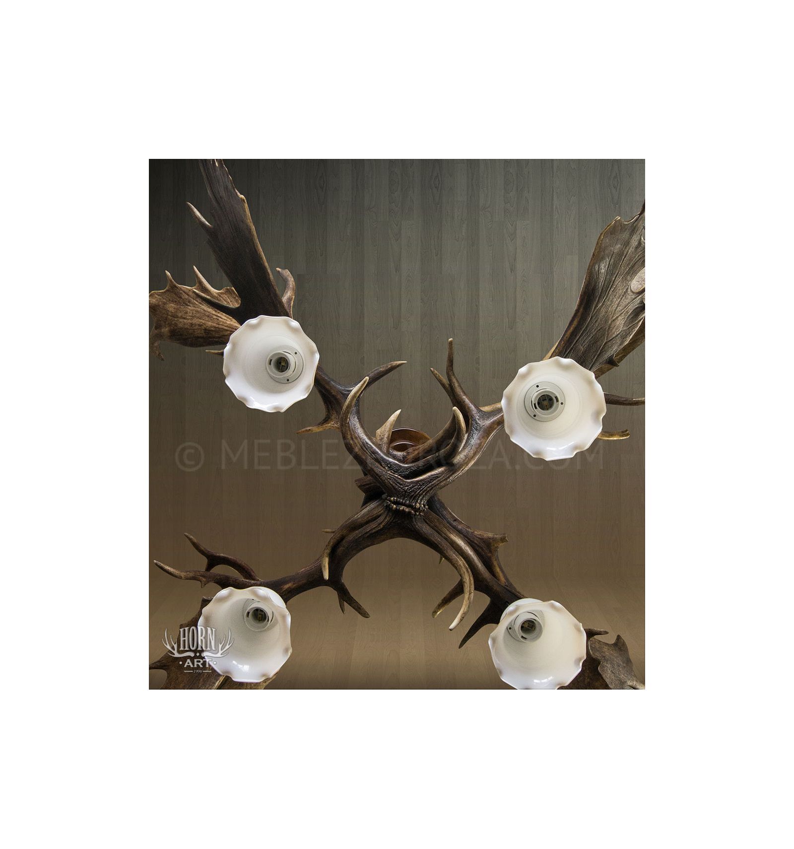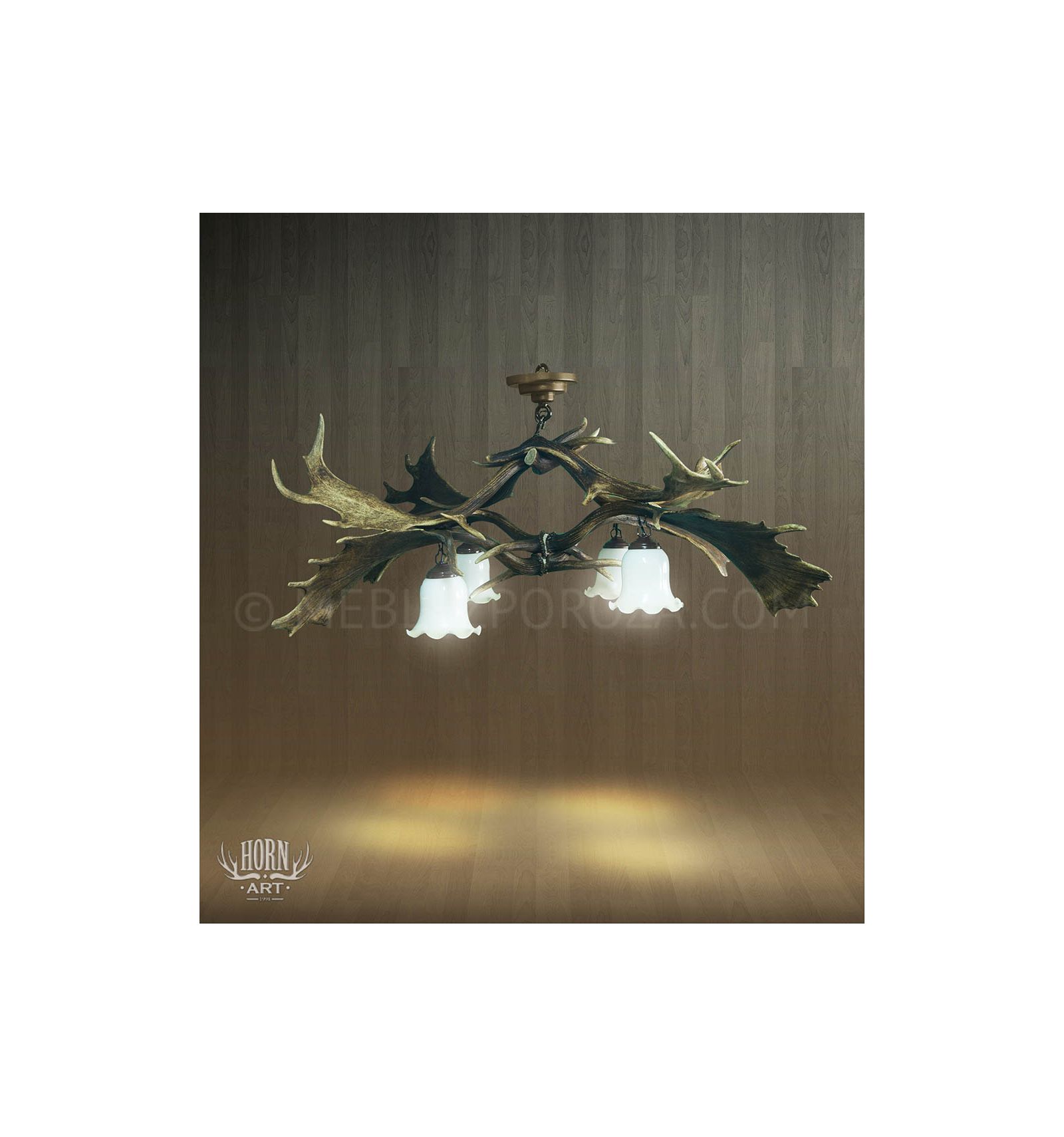 Jedyny w swoim rodzaju żyrandol z łopat daniela ozdobiony nietuzinkowymi czterema kloszami w kształcie dzwonków. Smukłe, piękne łopaty daniela w połączeniu z pięknymi kloszami prezentują się niezwykle imponująco i stanowią stylowe oświetlenie wnętrz. Lekkość i elegancja. Żyrandol z klasą.
