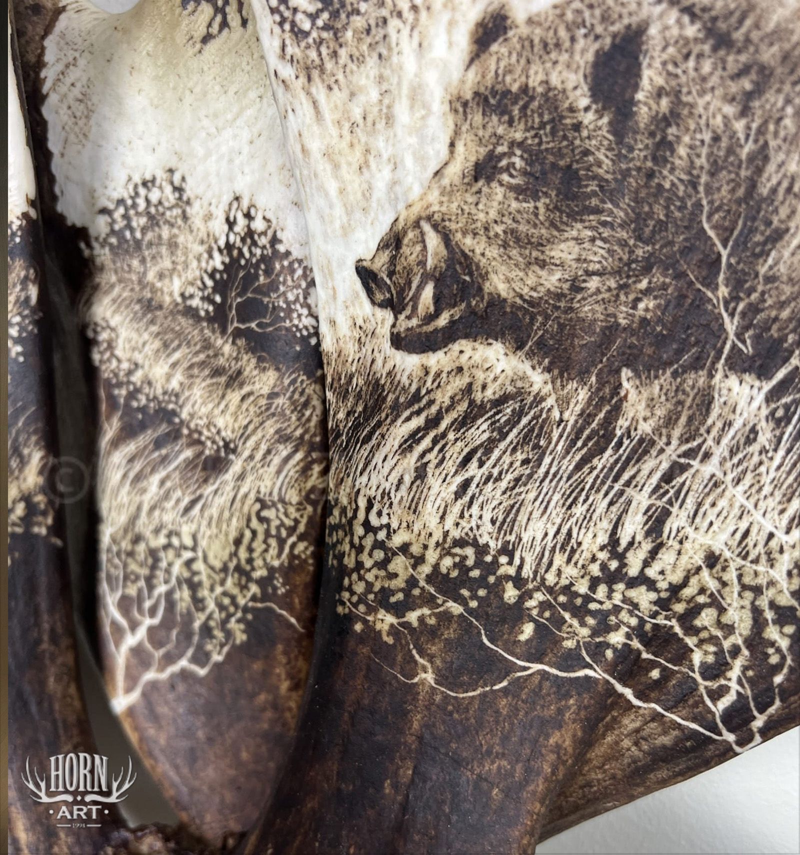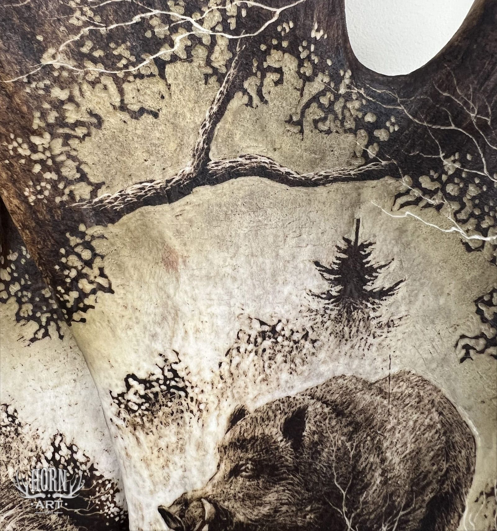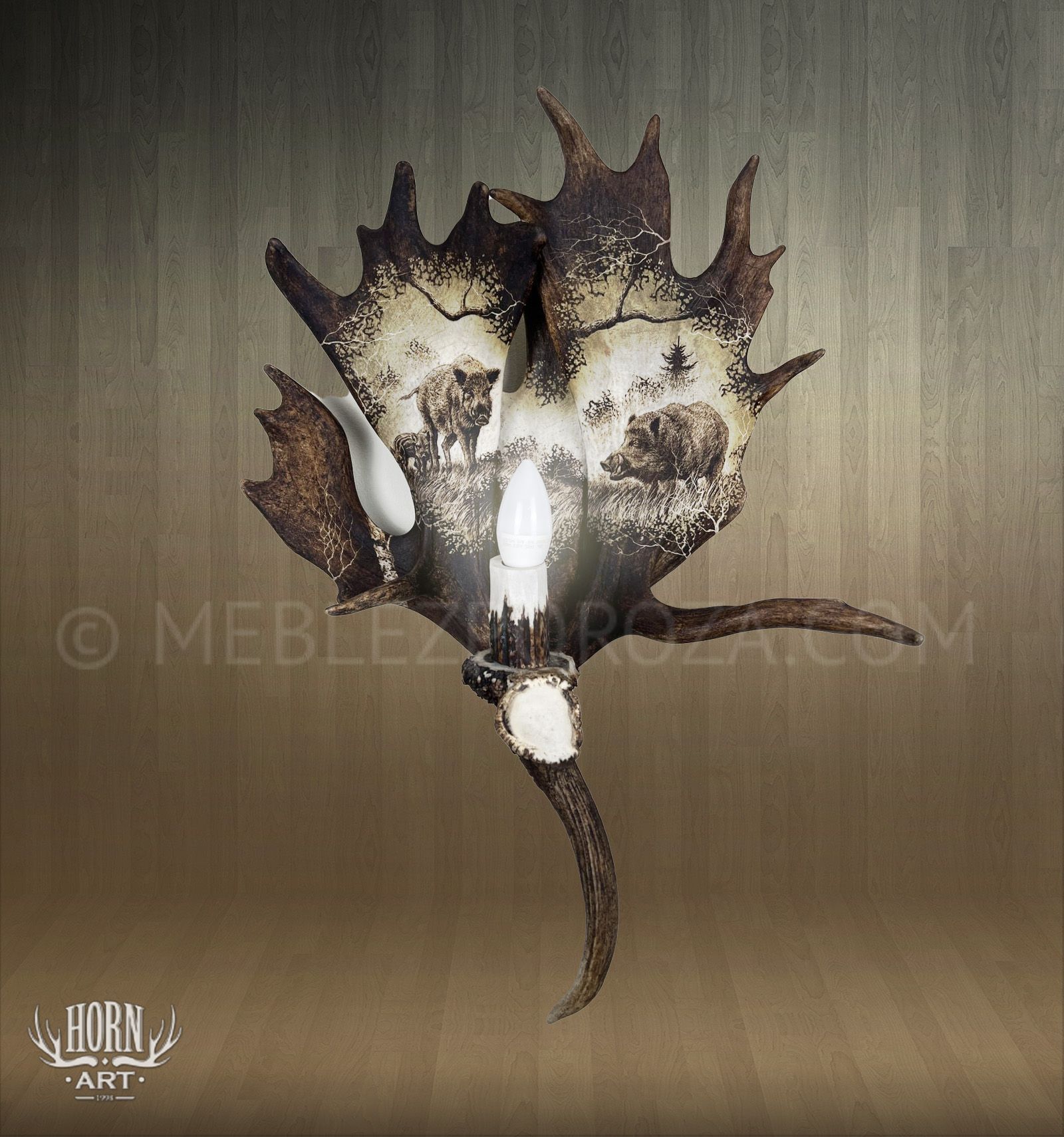 Wyjątkowy kinkiet ręcznie wykonany ze złączonych łopat daniela, ozdobionych artystycznym grawerunkiem przedstawiającym dziki na tle leśnego krajobrazu.
