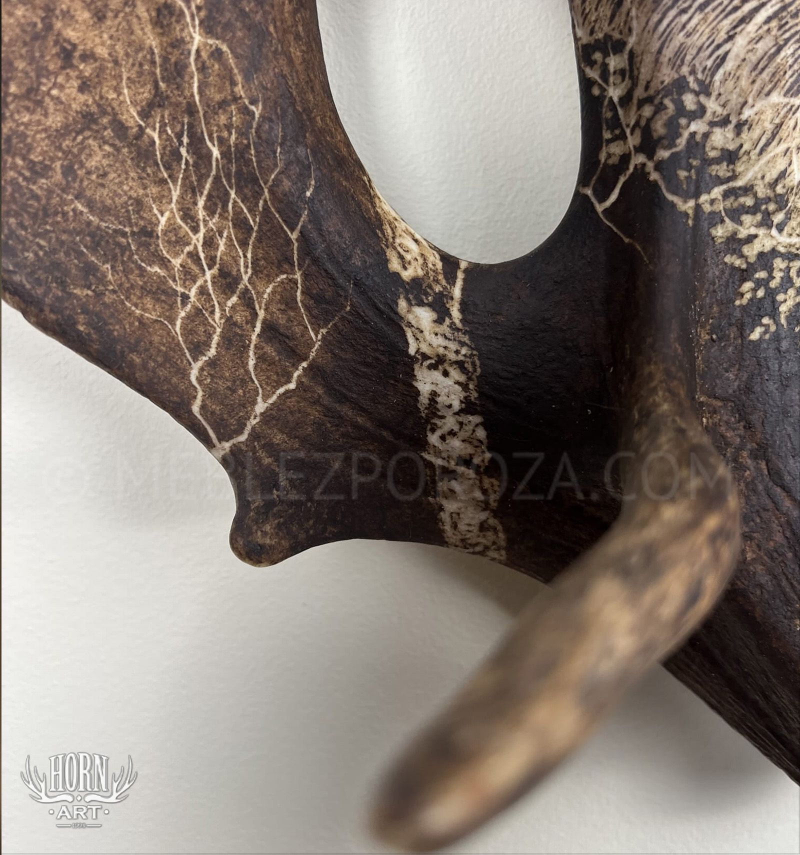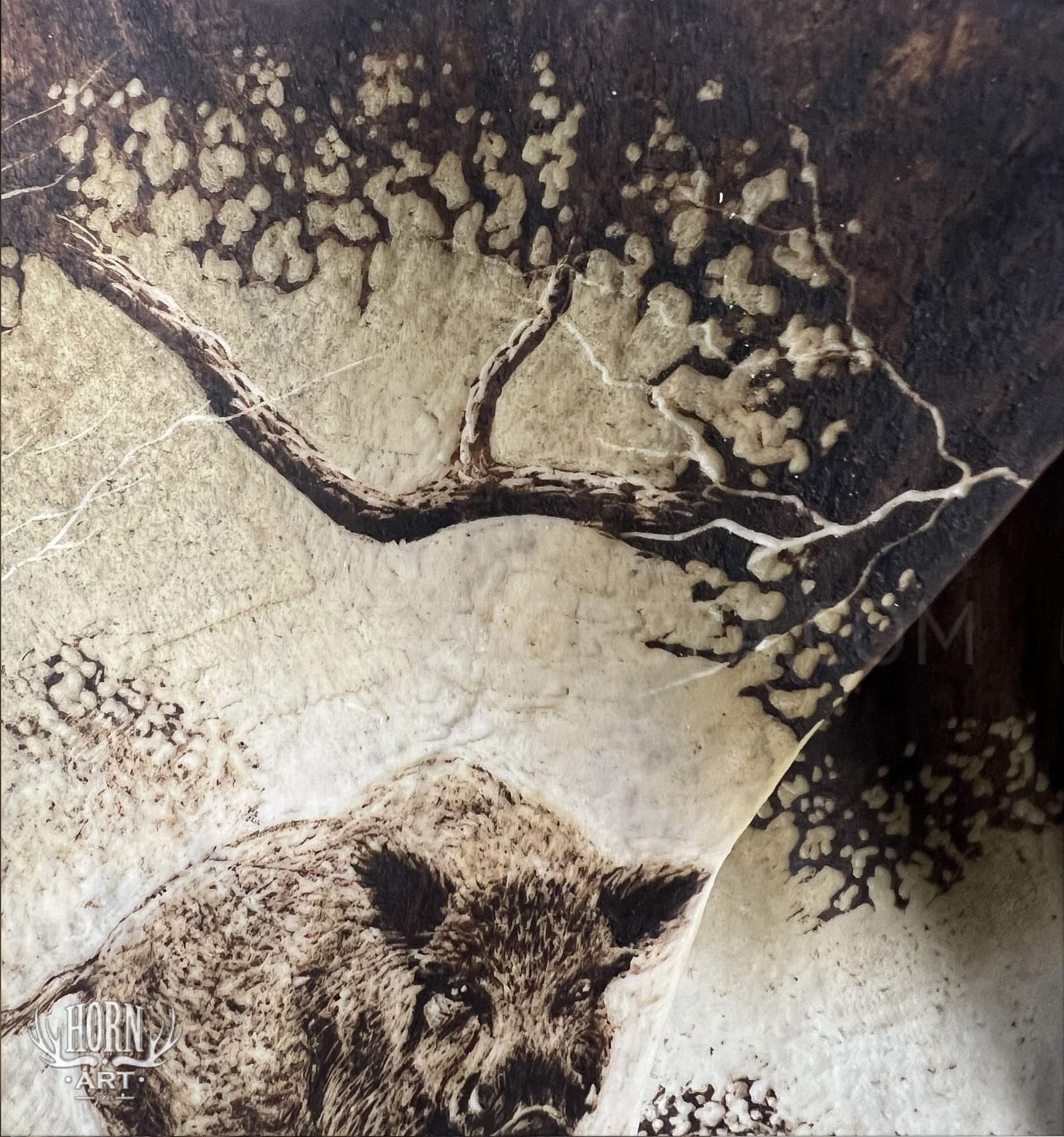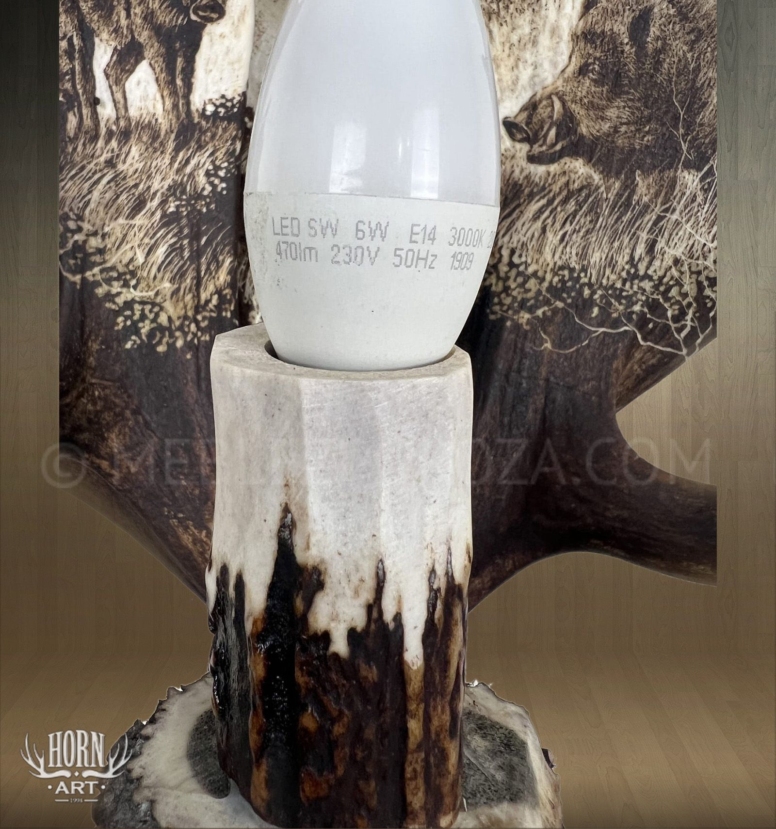 Wyjątkowy kinkiet ręcznie wykonany ze złączonych łopat daniela, ozdobionych artystycznym grawerunkiem przedstawiającym dziki na tle leśnego krajobrazu.