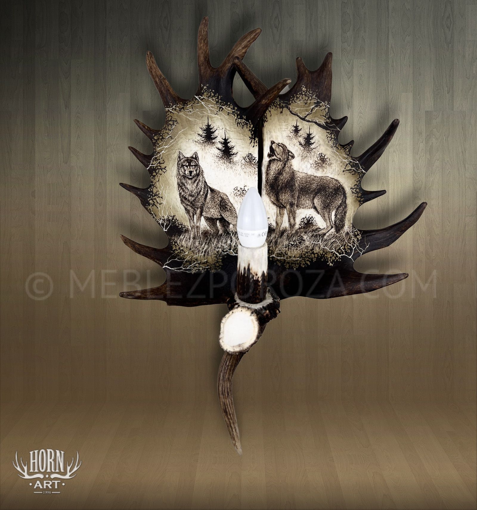 Ta oryginalna lampa to połączenie naturalnego piękna z praktycznym oświetleniem, a jej misterny grawer przedstawiający wilki nadaje całości niezwykłej głębi i artystycznego wyrazu.