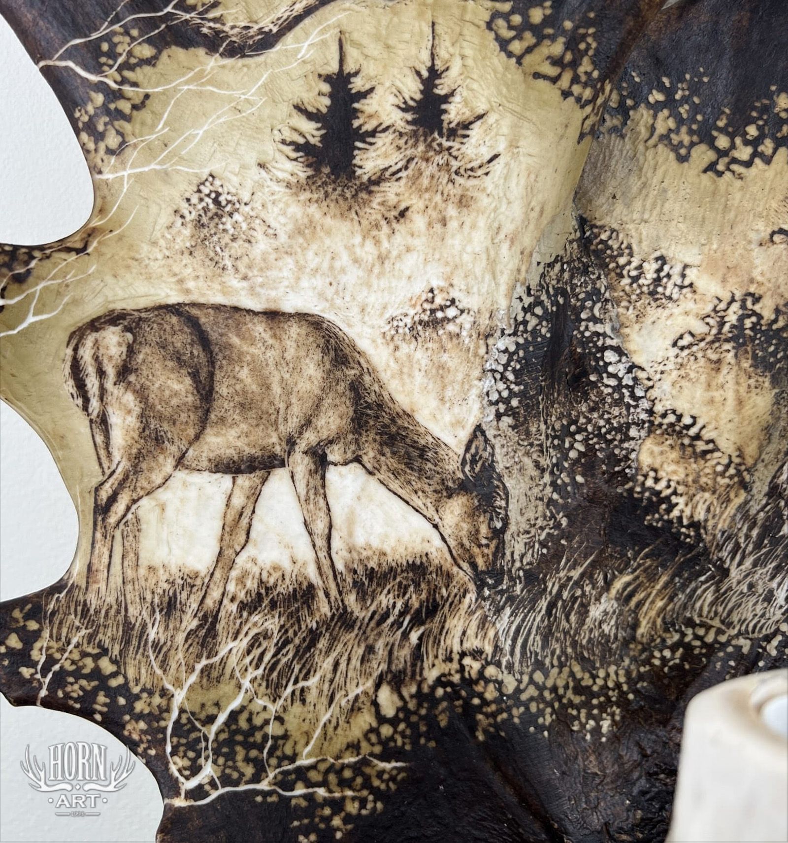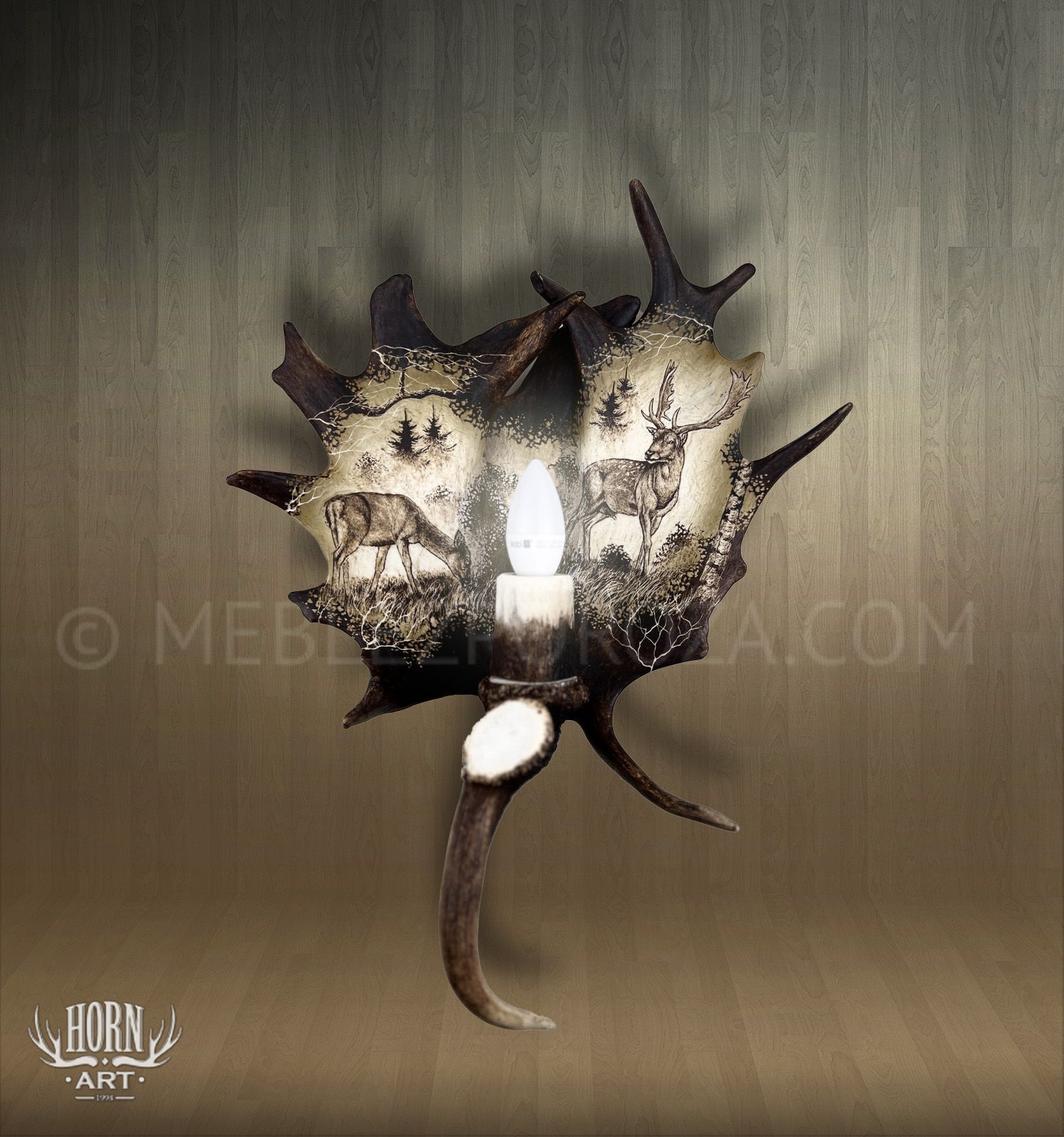 Dodaj wyjątkowy charakter swojemu wnętrzu dzięki grawerowanemu kinkietowi wykonanemu z naturalnych łopat daniela. To niezwykle oryginalne oświetlenie łączy naturalne piękno z funkcjonalnością, wprowadzając do pomieszczenia ciepło i myśliwski klimat.