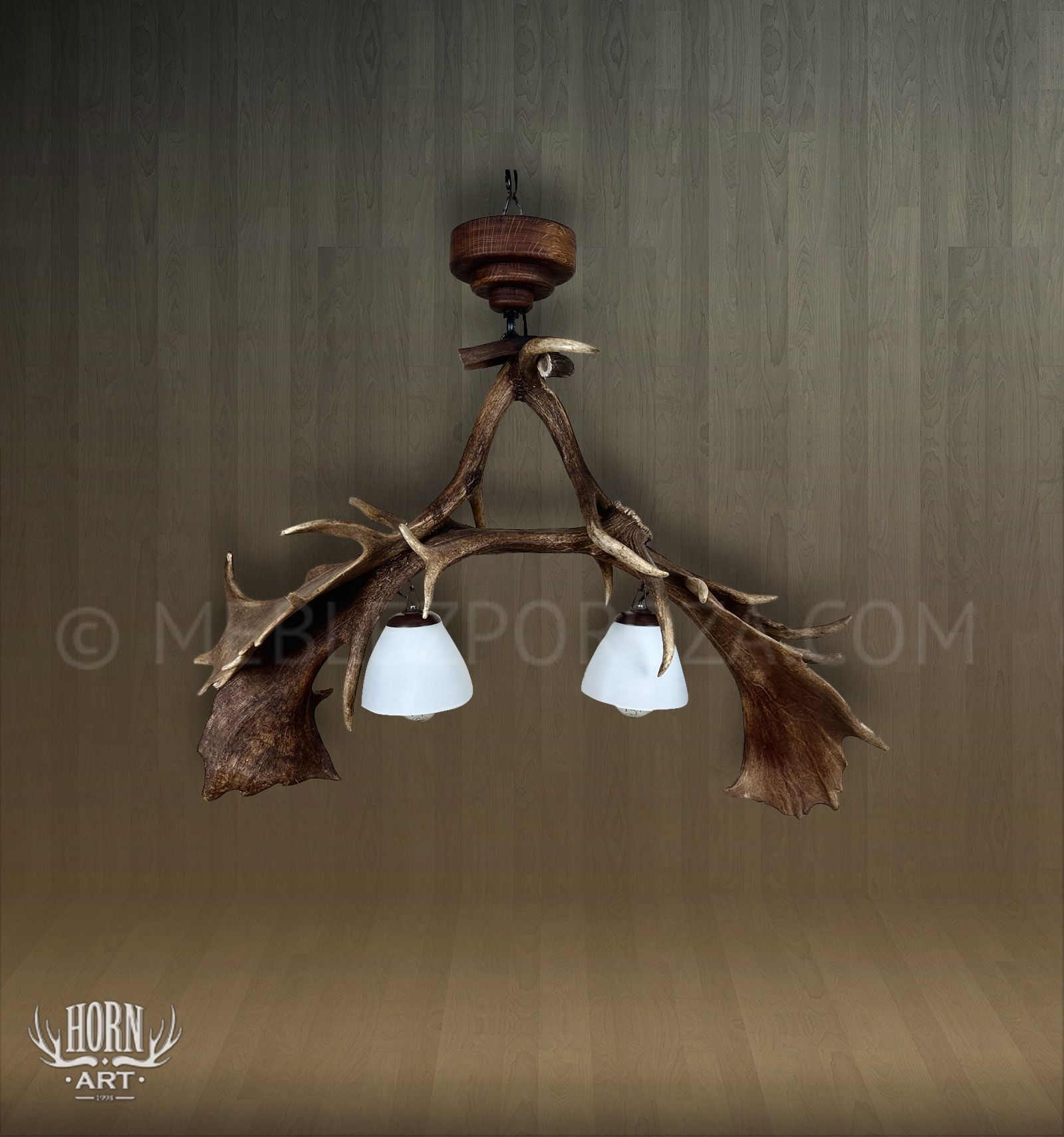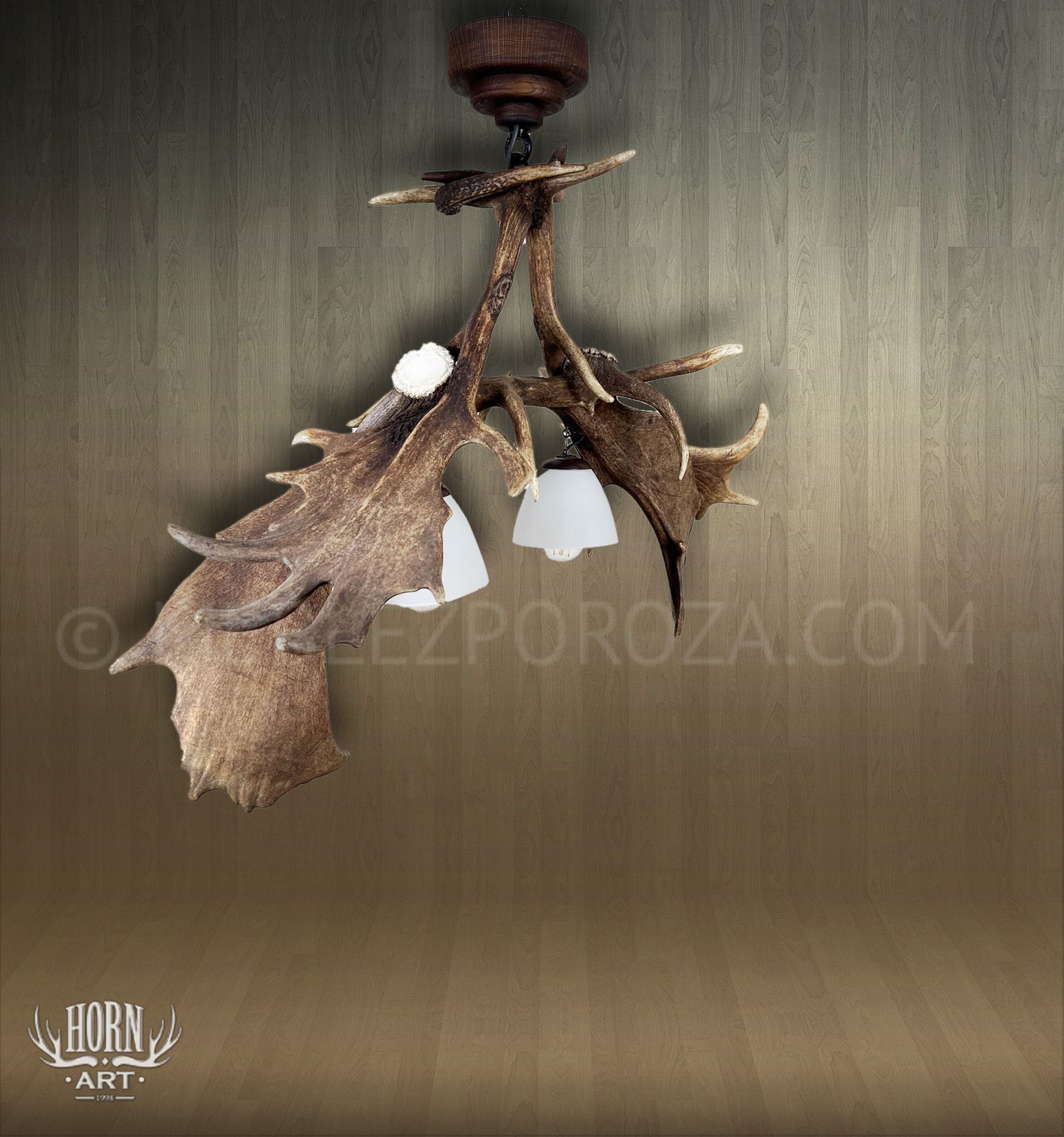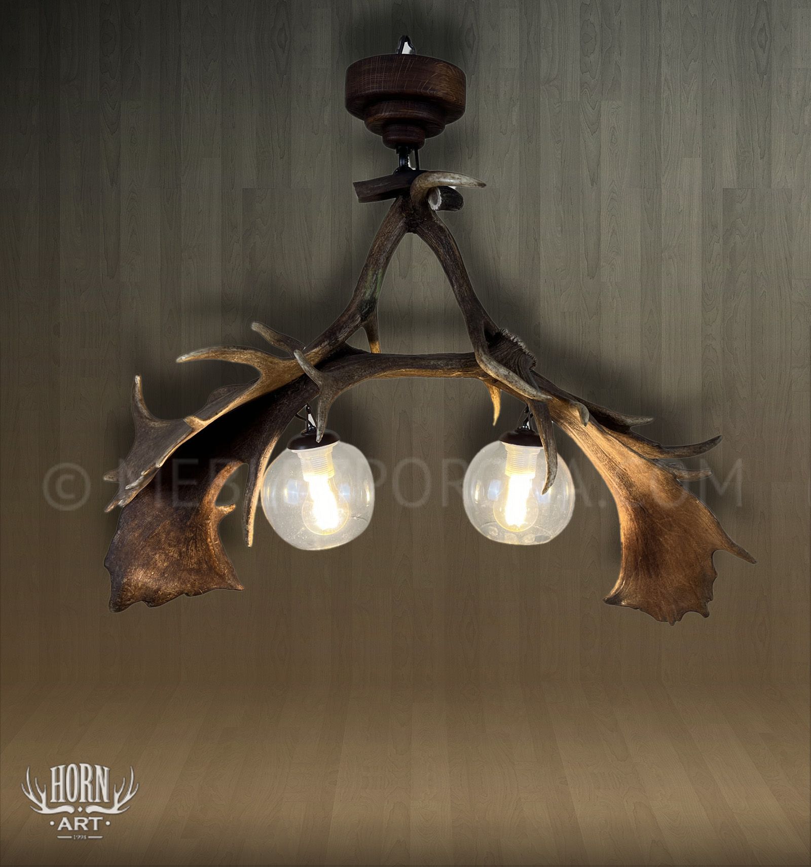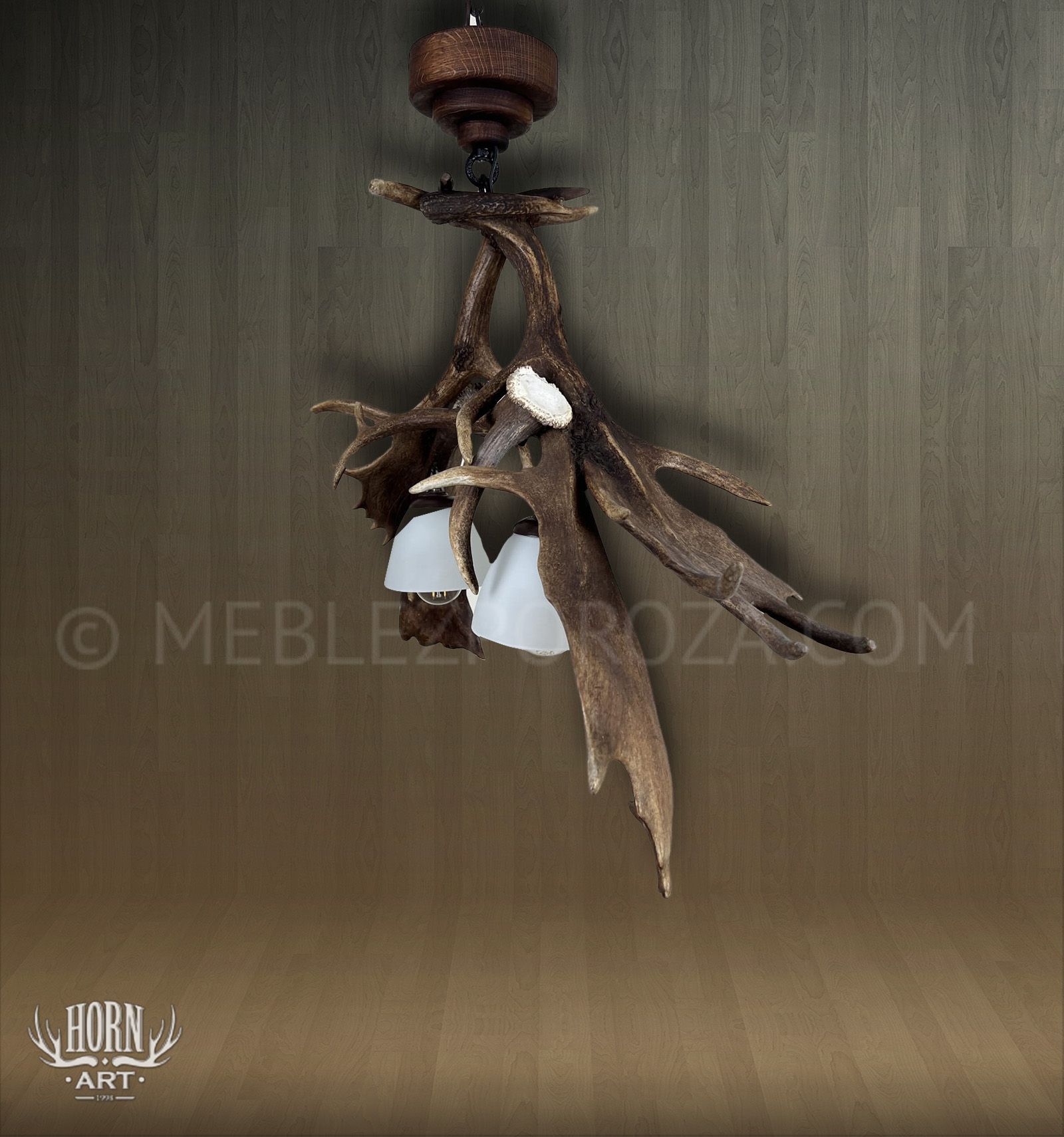 Żyrandol wyposażono w dwa punkty na żarówki, co zapewnia przyjemne, równomierne światło i podkreśla ciepły, elegancki nastrój wnętrza. Łopaty daniela układają się w harmonijną formę, która zachwyci miłośników przyrody oraz dekoracji z nutą myśliwskiego stylu.